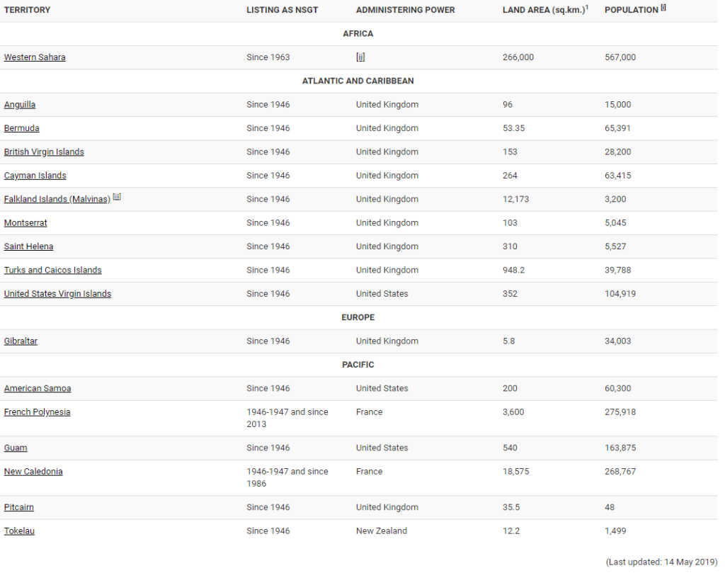Self-determination was an important world issue after WW2. In 1946, the UN list had 74 territories “whose people have not yet attained a full measure of self-government”. In 1963, the UN created a revised list of 64 territories and in 1990 confirmed it as one of the decade’s priorities. Today, that list is down to 17. Article 73, XI which outlines the responsibilities of these administering powers includes: “to develop self-government, to take due account of the political aspirations of the peoples, and to assist them in the progressive development of their free political institutions, according to the particular circumstances of each territory and its peoples and their varying stages of advancement.” Has there not been time for that over the past 74 years?
